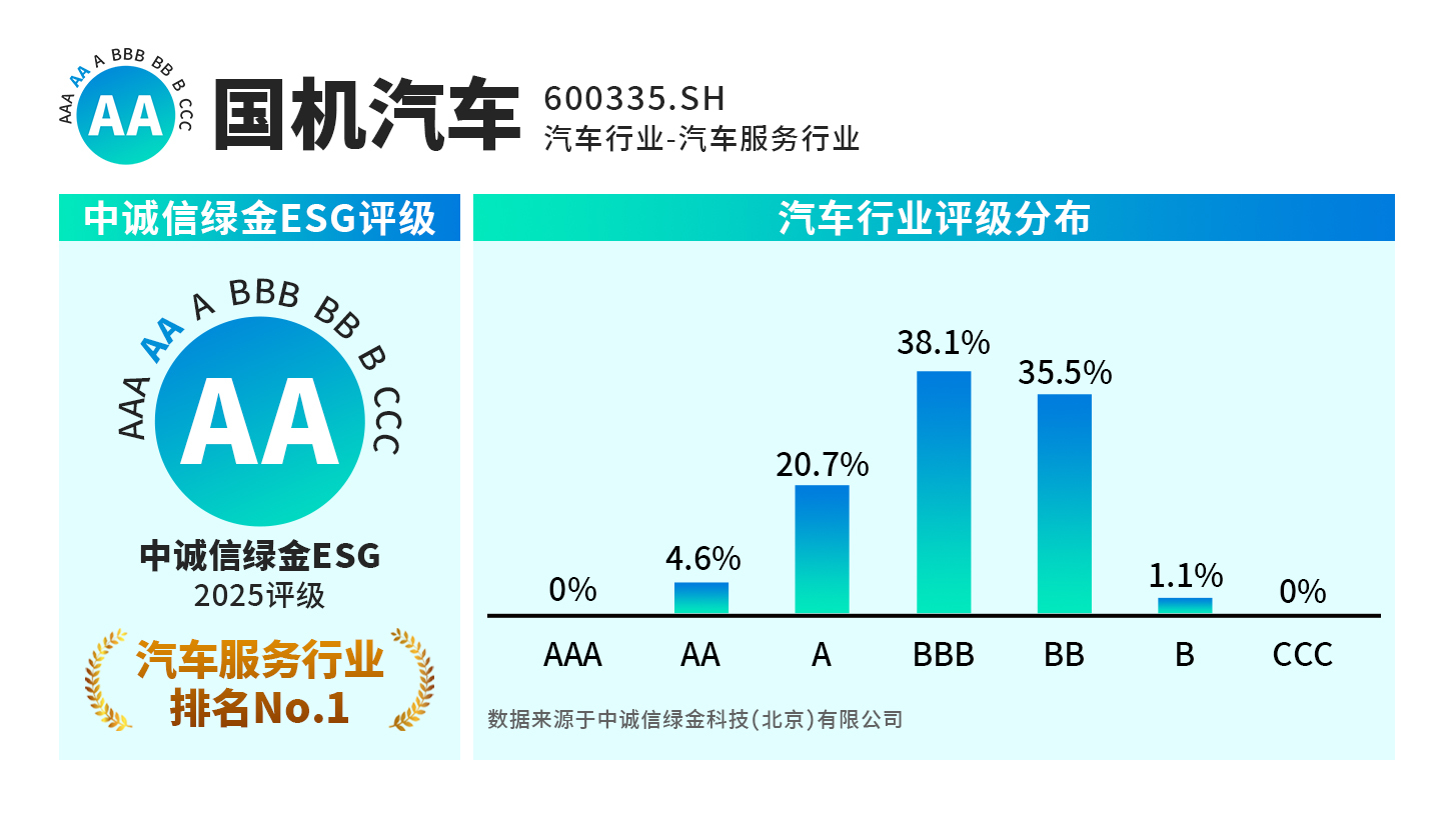 近日,國(guó)機(jī)汽車(chē)股份有限公司(證券代碼:600335.SH),榮獲所在行業(yè)中誠(chéng)信綠金ESG最高評(píng)級(jí)AA,躋身上市公司前4%行列,彰顯公司在環(huán)境、社會(huì)和治理(ESG)領(lǐng)域的卓越表現(xiàn)與顯著進(jìn)步。中誠(chéng)信綠金是中國(guó)領(lǐng)先的ESG評(píng)級(jí)機(jī)構(gòu),構(gòu)建了一套深度融合本土實(shí)踐與國(guó)際規(guī)范的評(píng)級(jí)體系,其將A...